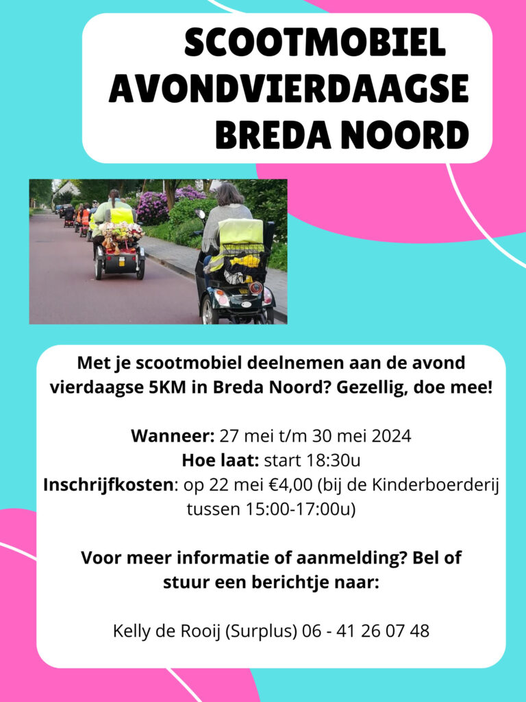 Wil je er ook even tussenuit? Scootmobielen zijn ook welkom bij onze vierdaagse. Wie weet doe je nog leuke contacten op. Voor meer informatie kun je contact opnemen met Kelly van Surplus, informatie op de flyer!